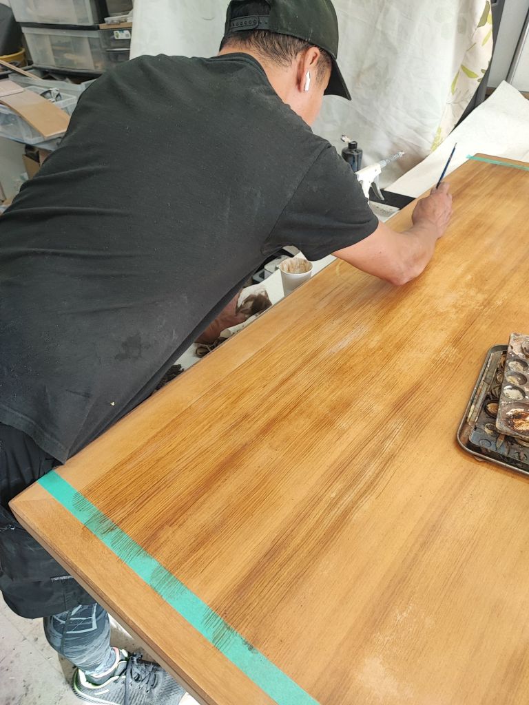 突板タイプで突板のプリントが抜けている箇所の木目を起こして行きます。